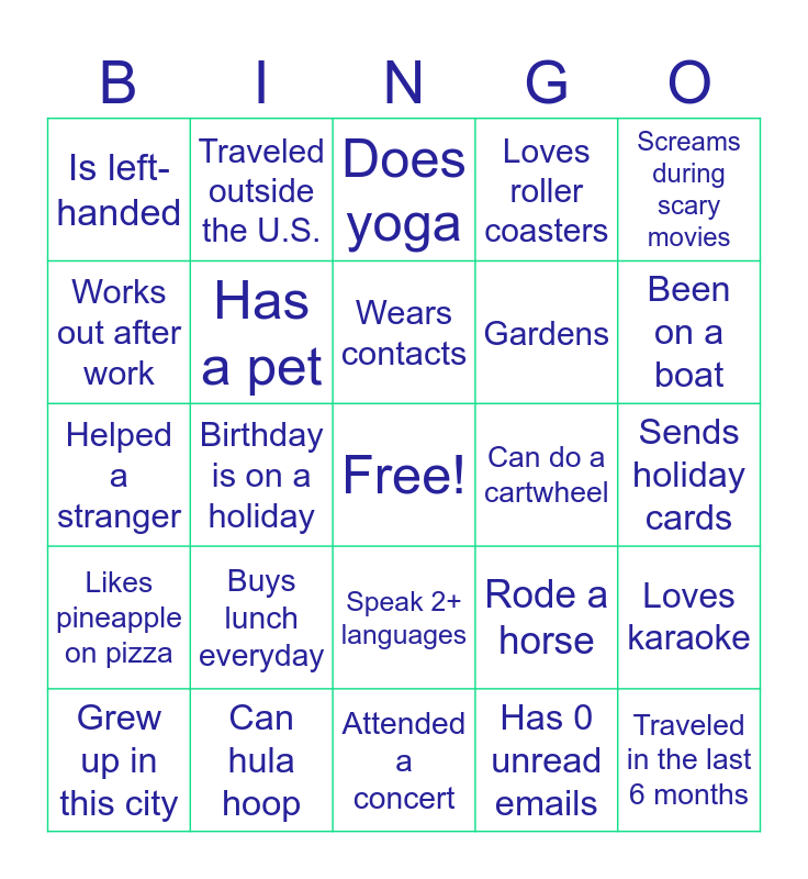 This bingo card has a free space and 24 words: Buys lunch everyday, Can hula hoop, Wears contacts, Grew up in this city, Screams during scary movies, Is left-handed, Works out after work, Traveled outside the U.S., Can do a cartwheel, Speak 2+ languages, Gardens, Helped a stranger, Rode a horse, Loves karaoke, Has a pet, Has 0 unread emails, Sends holiday cards, Does yoga, Been on a boat, Birthday is on a holiday, Traveled in the last 6 months, Likes pineapple on pizza, Loves roller coasters and Attended a concert.