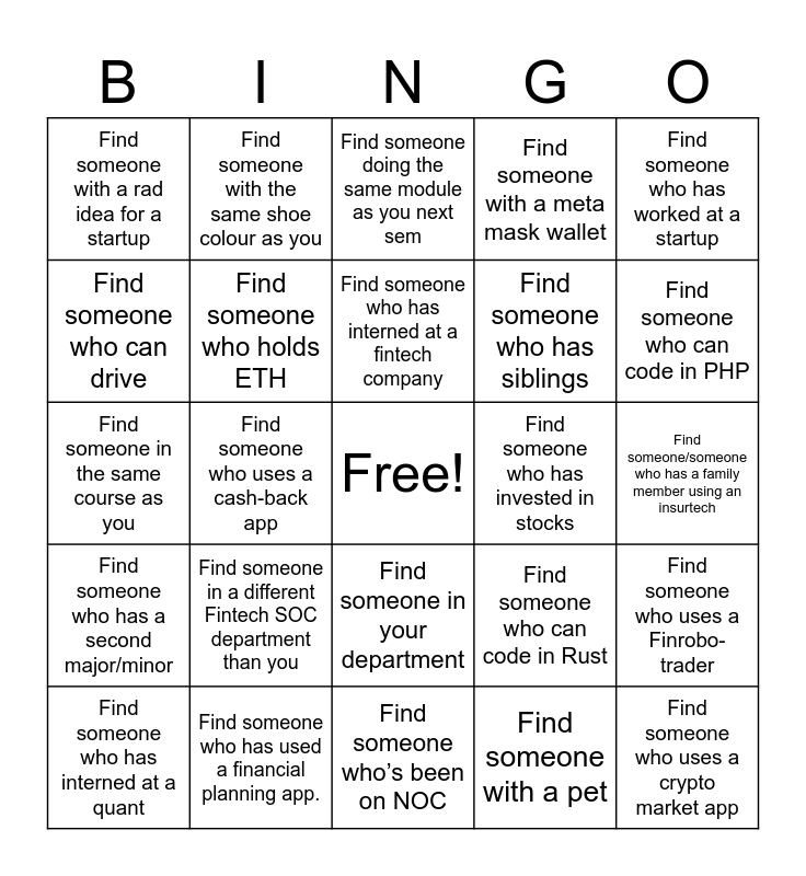 This bingo card has a free space and 40 words: Find someone who can code in solidity, Find someone in the same course as you, Find someone who holds BTC, Find someone who holds ETH, Find someone who has used a financial planning app., Find someone in your department, Find someone who has interned at a fintech company, Find someone who has completed a fintech-related course or certification., Find someone who has worked at a startup, Find someone who has a second major/minor, Find someone who uses a cash-back app, Find someone with a meta mask wallet, Find someone who uses a crypto market app, Find someone/someone who has a family member using an insurtech, Find someone who has invested in stocks, Find someone in a different Fintech SOC department than you, Find someone who is a founder, Find someone with a rad idea for a startup, Find someone in the same society as you (outside of fintech), Find someone doing the same module as you next sem, Find someone who uses a Finrobo-trader, Find someone with a pet, Find someone who has siblings, Find someone who can drive, Find someone who can play a musical instrument, Find someone who is left-handed, Find someone who went to polytechnic, Find someone who went to JC, Find someone who can speak another language other than English, Find someone who has a different age than you, Find someone with a Tech in Asia subscription, Find someone who has interned at a quant, Find someone who’s participated in a hackathon, Find someone who can code in Rust, Find someone who can code in PHP, Find someone who’s been on NOC, Find someone who does the same sport as you, Find someone staying in the same student residence as you, Find someone with the same shoe colour as you and Find who can name/has read 5 books.