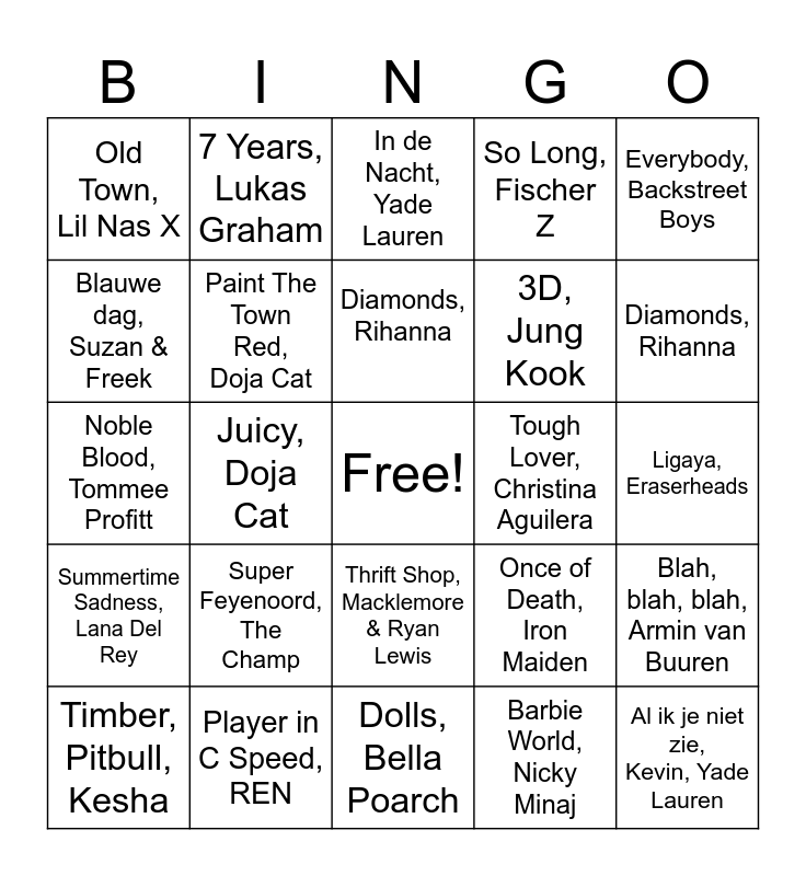 This bingo card has a free space and 24 words: Super Feyenoord, The Champ, Player in C Speed, REN, Diamonds, Rihanna, Timber, Pitbull, Kesha, Everybody, Backstreet Boys, Old Town, Lil Nas X, Blauwe dag, Suzan & Freek, 7 Years, Lukas Graham, Tough Lover, Christina Aguilera, Thrift Shop, Macklemore & Ryan Lewis, 3D, Jung Kook, Noble Blood, Tommee Profitt, Once of Death, Iron Maiden, Blah, blah, blah, Armin van Buuren, Paint The Town Red, Doja Cat, Barbie World, Nicky Minaj, Ligaya, Eraserheads, In de Nacht, Yade Lauren, Diamonds, Rihanna, Juicy, Doja Cat, Al ik je niet zie, Kevin, Yade Lauren, Summertime Sadness, Lana Del Rey, So Long, Fischer Z and Dolls, Bella Poarch.