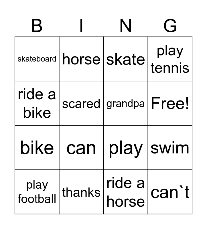 This bingo card has 18 words: can, can`t, skate, skateboard, play, play tennis, play football, horse, Free!, bike, ride a horse, ride a bike, swim, scared, grandpa, brave, thanks and look.