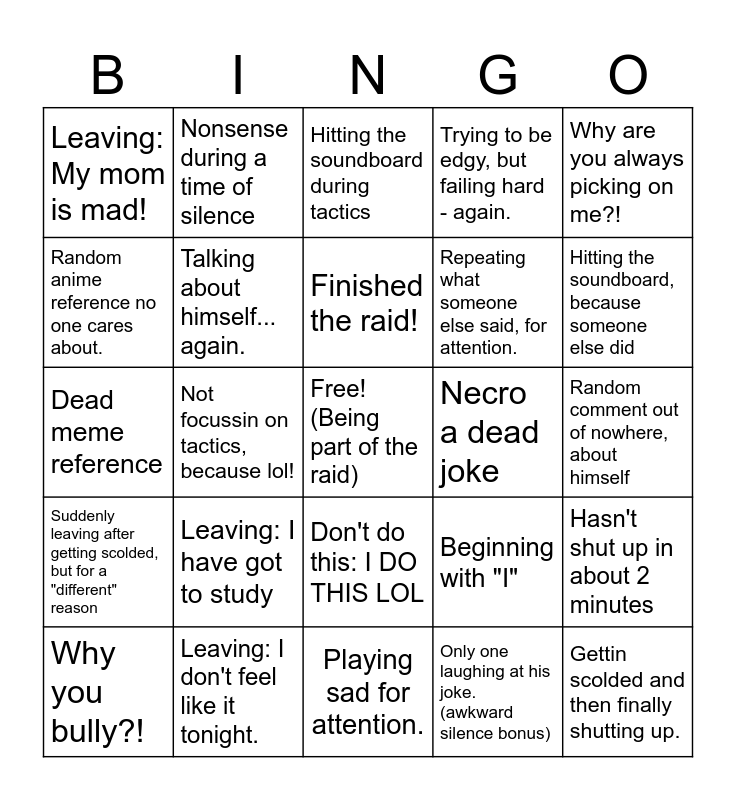 This bingo card has a free space and 24 words: Leaving: I have got to study, Leaving: I don't feel like it tonight., Finished the raid!, Why you bully?!, Why are you always picking on me?!, Leaving: My mom is mad!, Random anime reference no one cares about., Nonsense during a time of silence, Necro a dead joke, Don't do this: I DO THIS LOL, Repeating what someone else said, for attention., Dead meme reference, Beginning with "I", Hasn't shut up in about 2 minutes, Talking about himself... again., Only one laughing at his joke. (awkward silence bonus), Random comment out of nowhere, about himself, Hitting the soundboard during tactics, Hitting the soundboard, because someone else did, Not focussin on tactics, because lol!, Gettin scolded and then finally shutting up., Suddenly leaving after getting scolded, but for a "different" reason, Trying to be edgy, but failing hard - again. and Playing sad for attention..