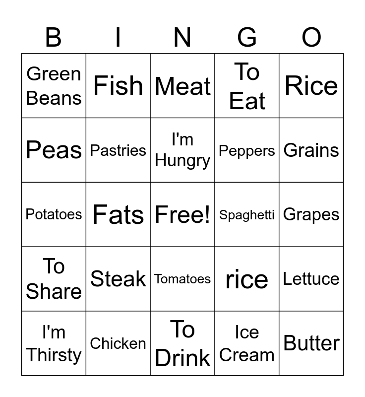 This bingo card has a free space and 24 words: Steak, Chicken, I'm Hungry, I'm Thirsty, Rice, Green Beans, Peas, Fish, Spaghetti, Tomatoes, Peppers, Potatoes, rice, Lettuce, Pastries, Ice Cream, Grapes, Meat, Grains, Fats, Butter, To Share, To Eat and To Drink.