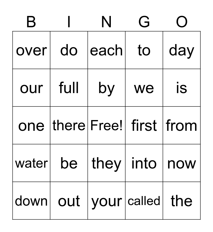 This bingo card has a free space and 24 words: down, be, by, called, day, over, do, each, first, from, one, full, into, now, our, out, your, to, is, water, there, they, we and the.