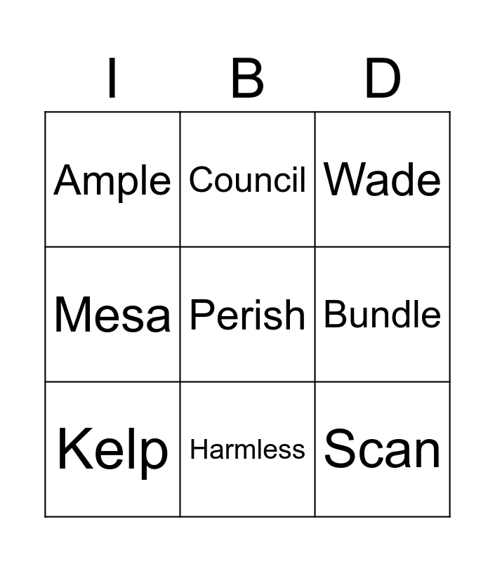 This bingo card has 10 words: Harmless, Wade, Ample, Perish, Mesa, Kelp, Council, Shirker, Bundle and Scan.