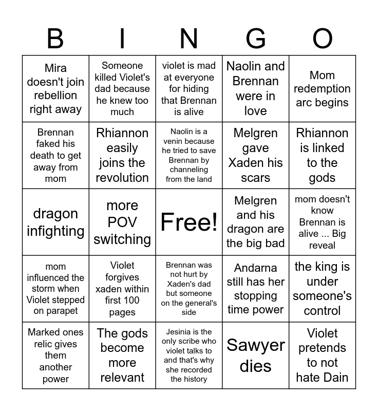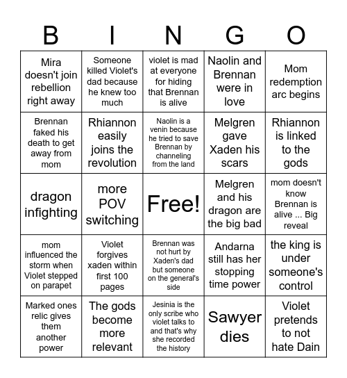 This bingo card has a free space and 24 words: Violet forgives xaden within first 100 pages, The gods become more relevant, Naolin is a venin because he tried to save Brennan by channeling from the land, Marked ones relic gives them another power, Mom redemption arc begins, Mira doesn't join rebellion right away, Brennan faked his death to get away from mom, Someone killed Violet's dad because he knew too much, Melgren and his dragon are the big bad, Brennan was not hurt by Xaden's dad but someone on the general's side, Melgren gave Xaden his scars, dragon infighting, Andarna still has her stopping time power, the king is under someone's control, Rhiannon easily joins the revolution, Sawyer dies, mom doesn't know Brennan is alive ... Big reveal, violet is mad at everyone for hiding that Brennan is alive, Rhiannon is linked to the gods, more POV switching, Violet pretends to not hate Dain, mom influenced the storm when Violet stepped on parapet, Naolin and Brennan were in love and Jesinia is the only scribe who violet talks to and that's why she recorded the history.