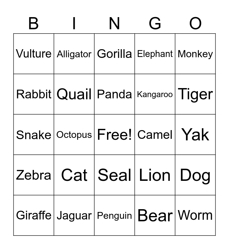 This bingo card has a free space and 24 words: Cat, Jaguar, Panda, Giraffe, Monkey, Vulture, Rabbit, Alligator, Camel, Seal, Kangaroo, Snake, Lion, Dog, Quail, Bear, Yak, Gorilla, Tiger, Octopus, Worm, Zebra, Elephant and Penguin.