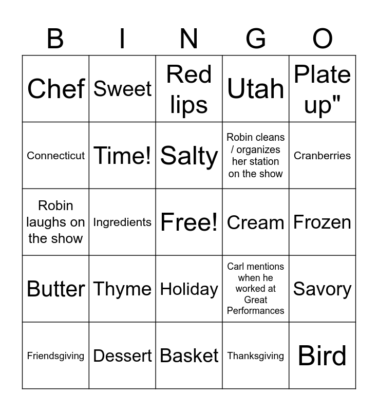 This bingo card has a free space and 29 words: Friendsgiving, Knife, Ingredients, Thank you judge, Chef, Red lips, Time!, Thyme, Cream, Dessert, Frozen, Bird, Basket, Thanksgiving, Cranberries, Football, Holiday, Butter, Plate up", Robin laughs on the show, Carl mentions when he worked at Great Performances, Robin gets censored on the show, Robin cleans / organizes her station on the show, Connecticut, Utah, Sweet, Savory, Salty and Someone gets burned on the show.