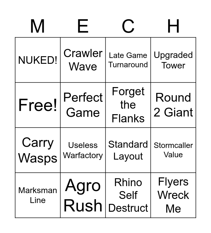 This bingo card has 16 words: Agro Rush, Stormcaller Value, Late Game Turnaround, NUKED!, Carry Wasps, Crawler Wave, Standard Layout, Rhino Self Destruct, Free!, Perfect Game, Marksman Line, Upgraded Tower, Useless Warfactory, Round 2 Giant, Forget the Flanks and Flyers Wreck Me.