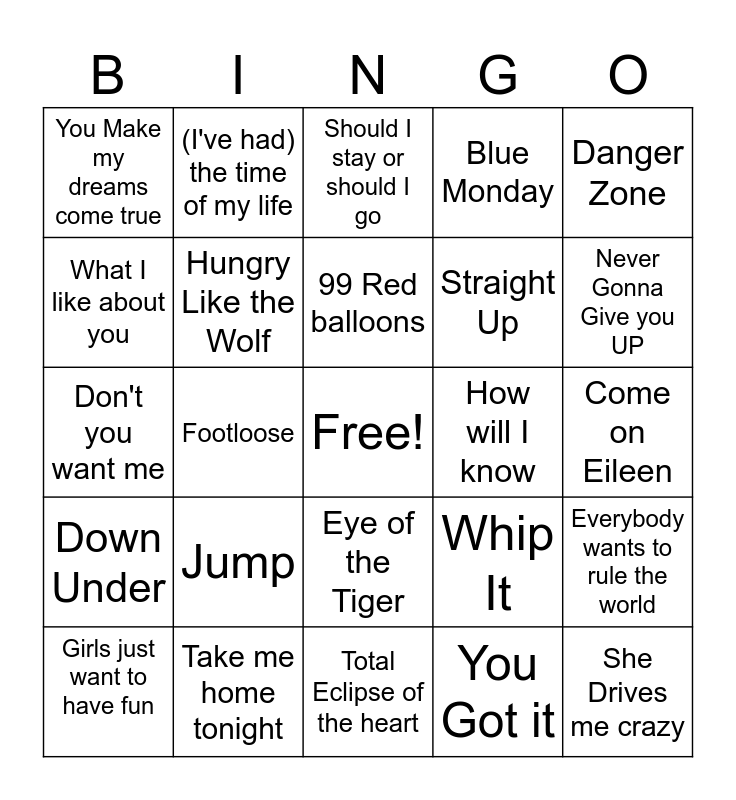 This bingo card has a free space and 39 words: Take on Me, Africa, Wake me up before you go-go, Hungry Like the Wolf, Girls just want to have fun, Eye of the Tiger, 99 Red balloons, 9 to 5, Danger Zone, Down Under, Footloose, Blue Monday, She Drives me crazy, Come on Eileen, How will I know, Jump, Sunglasses at Night, You Make my dreams come true, You can Call me Al, Whip It, What I like about you, Total Eclipse of the heart, Straight Up, Never Gonna Give you UP, Let's Dance, Keep on Loving You, I'm Gonna Be, Holding out for a hero, Don't You (forget about me), (I've had) the time of my life, Love Shack, Nothing's Gonna Stop us now, Should I stay or should I go, Take me home tonight, You Got it, Time after time, Everybody wants to rule the world, Don't you want me and What a feeling.