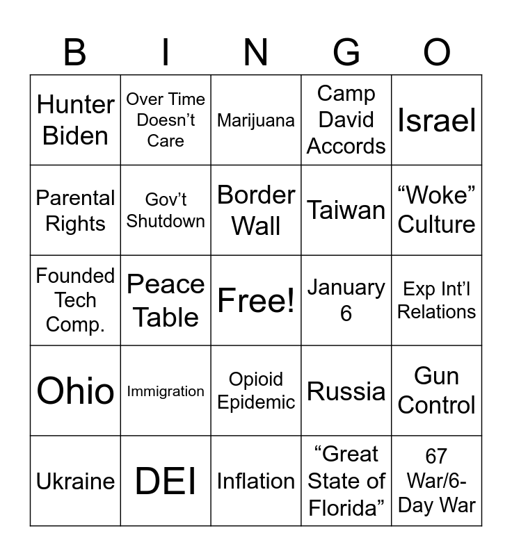 This bingo card has a free space and 37 words: Trump No Show, Trump Trial, DeSantis Smile, Gov’t Shutdown, Gun Control, Immigration, Border Wall, DeSantis “Small” Stature, Israel, Hamas, Peace Table, Camp David Accords, 67 War/6-Day War, Exp Int’l Relations, Parental Rights, Ohio, Abortion, Marijuana, Opioid Epidemic, January 6, Hunter Biden, “Woke” Culture, Ukraine, Inflation, Disney, “Great State of Florida”, Over Time Doesn’t Care, Over Time and Wraps, Stops before Time, Process Not Fair, Skirts the Question, DEI, Founded Tech Comp., “Christian” Allies, Russia, Taiwan and China.