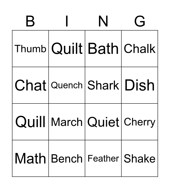 This bingo card has 36 words: Shell, Ship, Shoe, Shark, Sheep, Shake, Dish, Wish, Chat, Cheese, Cherry, Chalk, Chicken, Bench, March, Thumb, Thin, This, Math, Bath, Feather, Weather, Quack, Quick, Queen, Quilt, Quiet, Quirky, Quill, Quench, Brace, Break, Breeze, Bridge, Brown and Bronze.