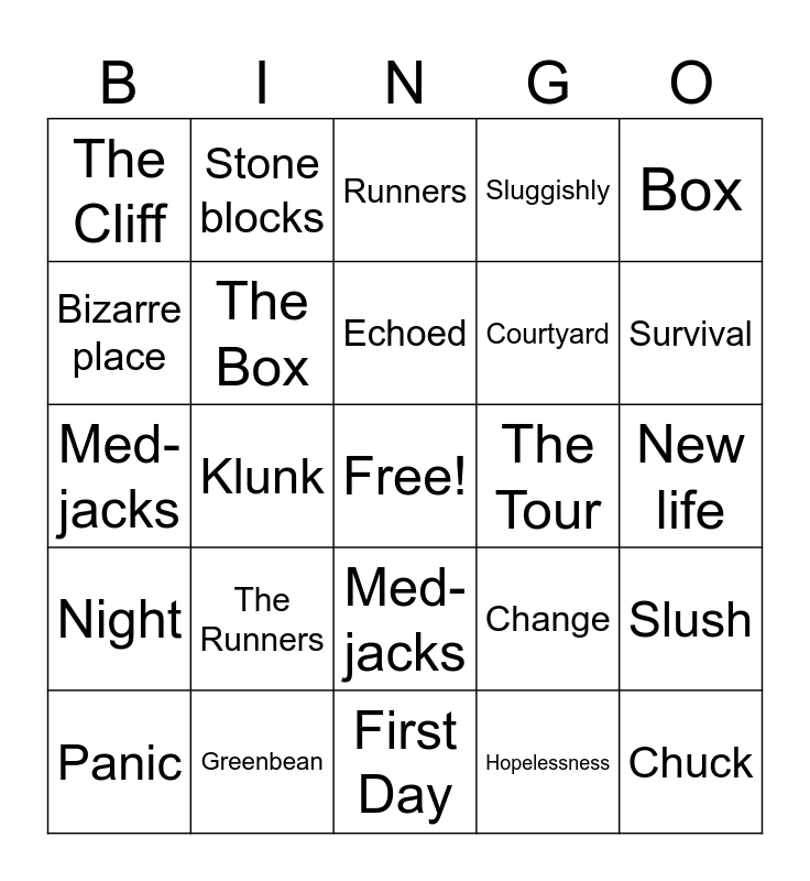 This bingo card has a free space and 30 words: Greenbean, The Glade, Klunk, Shuck, The Cliff, Runners, The Box, Med-jacks, The Tour, First Day, New life, Chuck, Hopelessness, The Maze, Survival, Panic, Change, Night, The Runners, Box, Med-jacks, Maze, Stone blocks, Courtyard, Bizarre place, Sluggishly, Slush, Panic, Echoed and Shrill.