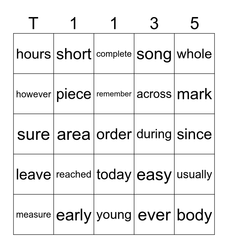 This bingo card has a free space and 24 words: reached, early, remember, measure, whole, hours, however, short, during, today, across, sure, easy, usually, piece, ever, since, complete, mark, area, body, leave, song and young.