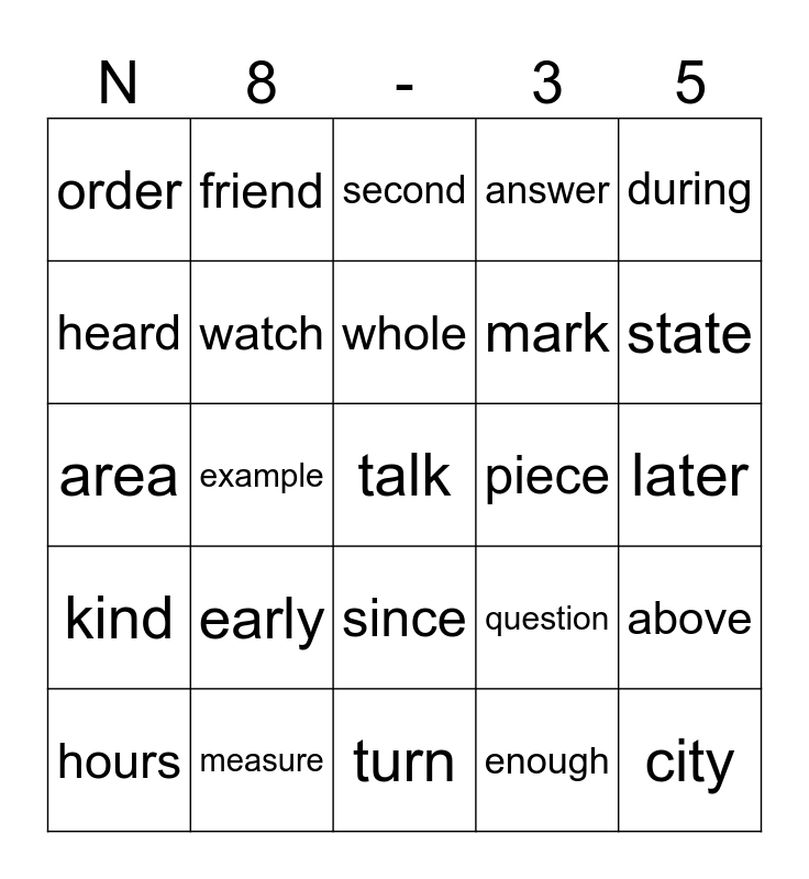 This bingo card has a free space and 24 words: early, measure, whole, hours, during, order, heard, friend, piece, since, mark, area, question, above, watch, enough, later, second, state, example, city, kind, answer and turn.