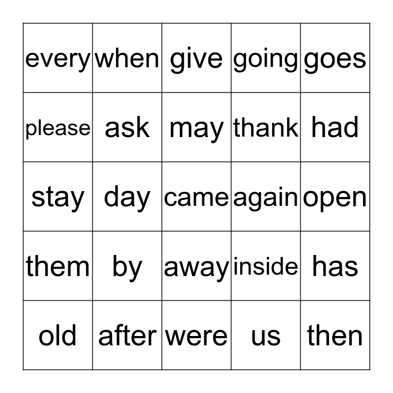 This bingo card has 25 words: by, were, may, old, goes, every, please, when, again, away, thank, stay, inside, has, ask, then, open, give, had, day, came, after, them, going and us.