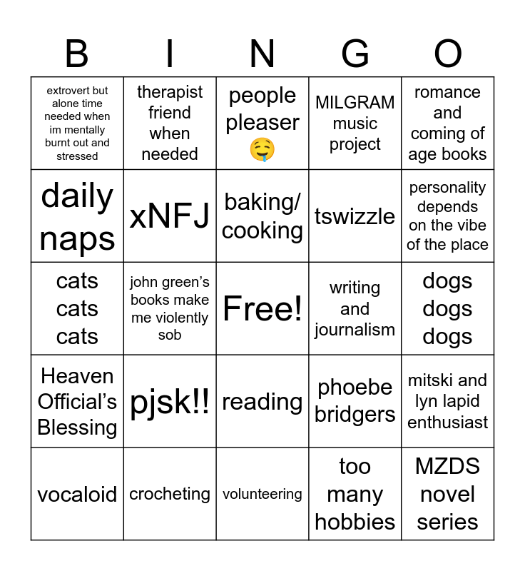 This bingo card has a free space and 24 words: pjsk!!, crocheting, baking/ cooking, vocaloid, romance and coming of age books, extrovert but alone time needed when im mentally burnt out and stressed, daily naps, therapist friend when needed, writing and journalism, reading, tswizzle, cats cats cats, phoebe bridgers, mitski and lyn lapid enthusiast, xNFJ, too many hobbies, dogs dogs dogs, people pleaser 🤤, personality depends on the vibe of the place, john green’s books make me violently sob, MZDS novel series, Heaven Official’s Blessing, MILGRAM music project and volunteering.