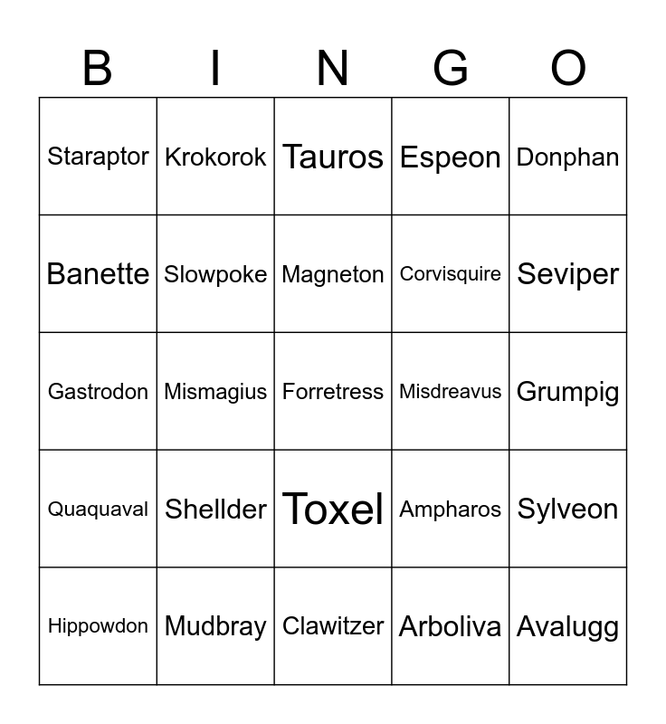 This bingo card has 371 words: Free!, Sprigatito, Floragato, Meowscarada, Fuecoco, Crocalor, Skeledirge, Quaxly, Quaxwell, Quaquaval, Lechonk, Oinkologne, Tarountula, Spidops, Nymble, Lokix, Hoppip, Skiploom, Jumpluff, Fletchling, Fletchinder, Talonflame, Pawmi, Pawmo, Pawmot, Houndour, Houndoom, Yungoos, Gumshoos, Skwovet, Greedent, Sunkern, Sunflora, Kricketot, Kricketune, Scatterbug, Spewpa, Vivillon, Combee, Vespiquen, Rookidee, Corvisquire, Corviknight, Happiny, Chansey, Blissey, Azurill, Marill, Azumarill, Surskit, Masquerain, Buizel, Floatzel, Wooper, Clodsire, Psyduck, Golduck, Chewtle, Drednaw, Igglybuff, Jigglypuff, Wigglytuff, Ralts, Kirlia, Gardevoir, Gallade, Drowzee, Hypno, Gastly, Haunter, Gengar, Tandemaus, Maushold, Pichu, Pikachu, Raichu, Fidough, Dachsbun, Slakoth, Vigoroth, Slaking, Bounsweet, Steenee, Tsareena, Smoliv, Dolliv, Arboliva, Bonsly, Sudowoodo, Rockruff, Lycanroc, Rolycoly, Carkol, Coalossal, Shinx, Luxio, Luxray, Starly, Staravia, Staraptor, Oricorio, Mareep, Flaaffy, Ampharos, Petilil, Lilligant, Shroomish, Breloom, Applin, Flapple, Appletun, Spoink, Grumpig, Squawkabilly, Misdreavus, Mismagius, Makuhita, Hariyama, Crabrawler, Crabominable, Salandit, Salazzle, Phanpy, Donphan, Cufant, Copperajah, Gible, Gabite, Garchomp, Nacli, Naclstack, Garganacl, Wingull, Pelipper, Magikarp, Gyarados, Arrokuda, Barraskewda, Basculin, Gulpin, Swalot, Meowth, Persian, Flabébé, Floette, Florges, Diglett, Dugtrio, Torkoal, Numel, Camerupt, Bronzor, Bronzong, Axew, Fraxure, Haxorus, Mankey, Primeape, Annihilape, Meditite, Medicham, Riolu, Lucario, Charcadet, Ceruledge, Barboach, Whiscash, Tadbulb, Bellibolt, Goomy, Sliggoo, Goodra, Croagunk, Toxicroak, Wattrel, Kilowattrel, Eevee, Vaporeon, Jolteon, Flareon, Espeon, Umbreon, Leafeon, Glaceon, Sylveon, Dunsparce, Dudunsparce, Deerling, Sawsbuck, Girafarig, Farigiraf, Grimer, Muk, Maschiff, Mabosstiff, Toxel, Toxtricity, Dedenne, Pachirisu, Shroodle, Grafaiai, Stantler, Foongus, Amoonguss, Voltorb, Electrode, Magnemite, Magneton, Magnezone, Ditto, Growlithe, Arcanine, Teddiursa, Ursaring, Zangoose, Seviper, Swablu, Altaria, Skiddo, Gogoat, Tauros, Litleo, Pyroar, Zorua, Zoroark, Sneasel, Weavile, Murkrow, Honchkrow, Gothita, Gothorita, Gothitelle, Sinistea, Polteageist, Mimikyu, Klefki, Indeedee, Bramblin, Brambleghast, Toedscool, Toedscruel, Tropius, Fomantis, Lurantis, Klawf, Capsakid, Scovillain, Cacnea, Cacturne, Rellor, Rabsca, Venonat, Venomoth, Pineco, Forretress, Scyther, Scizor, Heracross, Flittle, Espathra, Hippopotas, Hippowdon, Sandile, Krokorok, Krookodile, Silicobra, Sandaconda, Mudbray, Mudsdale, Larvesta, Volcarona, Bagon, Shelgon, Salamence, Tinkatink, Tinkatuff, Tinkaton, Hatenna, Hattrem, Hatterene, Impidimp, Morgrem, Grimmsnarl, Wiglett, Wugtrio, Bombirdier, Finizen, Palafin, Varoom, Revavroom, Cyclizar, Orthworm, Sableye, Shuppet, Banette, Falinks, Hawlucha, Spiritomb, Noibat, Noivern, Dreepy, Drakloak, Dragapult, Glimmet, Glimmora, Rotom, Greavard, Houndstone, Passimian, Komala, Eiscue, Pincurchin, Sandygast, Palossand, Slowpoke, Slowbro, Slowking, Shellos, Gastrodon, Shellder, Cloyster, Qwilfish, Luvdisc, Finneon, Lumineon, Bruxish, Alomomola, Clauncher, Clawitzer, Tynamo, Eelektrik, Eelektross, Mareanie, Toxapex, Flamigo, Dratini, Dragonair, Dragonite, Snom, Frosmoth, Snover, Abomasnow, Delibird, Cubchoo, Beartic, Snorunt, Glalie, Froslass, Cryogonal, Cetoddle, Cetitan, Bergmite, Avalugg, Rufflet, Braviary, Pawniard, Bisharp, Kingambit, Veluza, Dondozo, Tatsugiri, Frigibax, Arctibax, Baxcalibur, Iron Valiant, Iron Treads, Iron Bundle, Iron Hands, Iron Jugulis, Iron Moth and Iron Thorns.