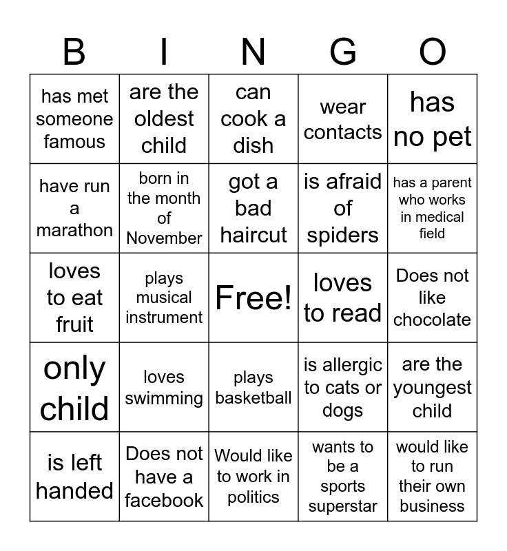 This bingo card has a free space and 29 words: is left handed, is wearing glasses, plays musical instrument, is a business owner, has met someone famous, can cook a dish, born in the month of November, loves swimming, loves to read, Does not have a facebook, Does not like chocolate, would like to run their own business, Would like to work in politics, wants to be a sports superstar, has a parent who works in medical field, speaks 3 or more languages, plays basketball, only child, has no pet, loves to eat fruit, is allergic to cats or dogs, loves to draw, is afraid of spiders, have run a marathon, wear contacts, are the oldest child, are the youngest child, got a bad haircut and got in an argument with your friend.