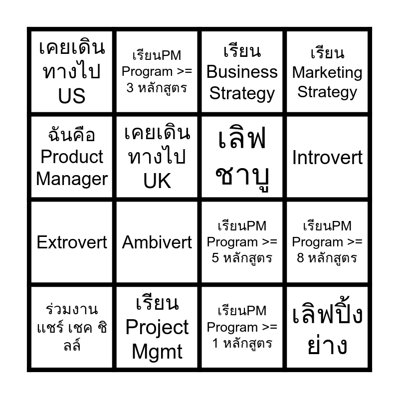 This bingo card has 16 words: ร่วมงานแชร์ เชค ชิลล์, เรียน Project Mgmt, เรียน Business Strategy, เรียน Marketing Strategy, ฉันคือ Product Manager, เรียนPM Program >= 3 หลักสูตร, เรียนPM Program >= 5 หลักสูตร, เรียนPM Program >= 8 หลักสูตร, เคยเดินทางไป US, เคยเดินทางไป UK, เรียนPM Program >= 1 หลักสูตร, Introvert, Extrovert, Ambivert, เลิฟชาบู and เลิฟปิ้งย่าง.