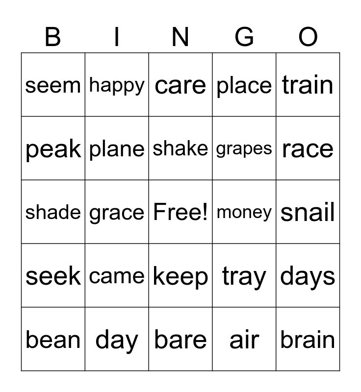 This bingo card has a free space and 24 words: came, day, shake, bean, train, seem, peak, happy, money, keep, grapes, shade, tray, days, plane, air, snail, care, race, grace, brain, seek, place and bare.