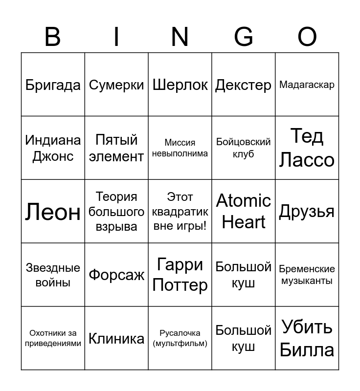 This bingo card has a free space and 25 words: Форсаж, Русалочка (мультфильм), Миссия невыполнима, Охотники за приведениями, Мадагаскар, Бригада, Индиана Джонс, Сумерки, Atomic Heart, Гарри Поттер, Бойцовский клуб, Леон, Большой куш, Бременские музыканты, Пятый элемент, Во все тяжкие, Друзья, Шерлок, Тед Лассо, Теория большого взрыва, Убить Билла, Клиника, Звездные войны, Декстер and Большой куш.