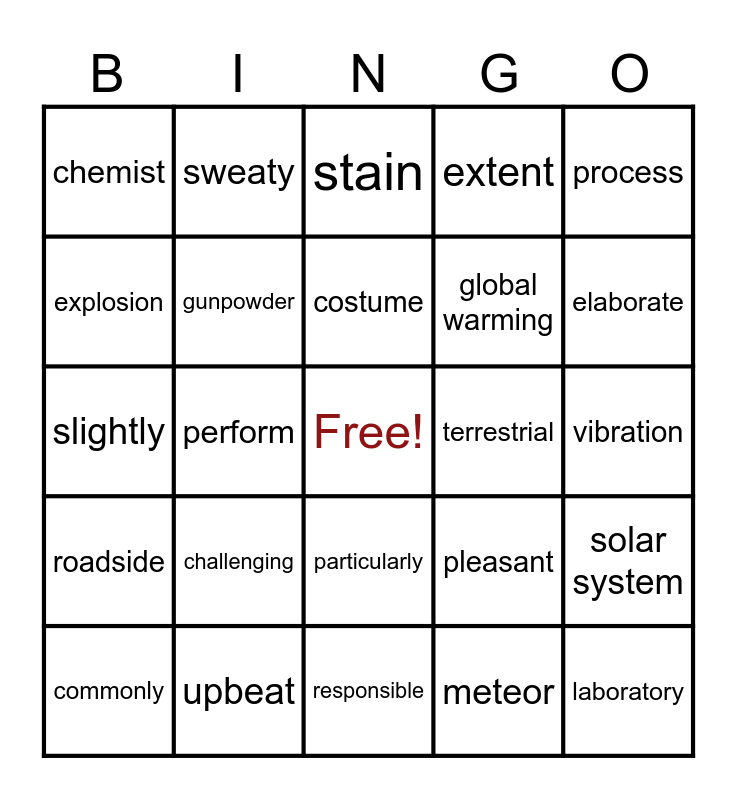 This bingo card has a free space and 113 words: frustrate, ruin, prevent, pupil, reflect, retina, extent, surrounding, reduction, swirling, acidic, liquid, vinegar, temporary, traditionally, occasion, particularly, relative, eleborate, custom, commonly, stain, mother-in-law, completely, tattoo, roadside, upbeat, exotic, attraction, vibrant, elaborate, costume, perform, refresh, originally, response, racial, tension, immigrant, riot, solution, organize, success, decade, diversity, region, meteor, explosion, injure, astronomer, asteroid, terrestrial, alert, approach, in advance, reliable, properly, overcome, limitation, currently, solar system, astronaut, notice, unusual, weird, totally, describe, gunpowder, slightly, quality, vibration, particle, assume, precise, realistic, laboratory, challenging, chemist, reproduce, description, chemical, sweaty, gasoline, pleasant, global warming, benefit, invention, modern, fossil fuel, carbon dioxide, absorb, atmosphere, process, surface, amount, disastrous, estimate, Arctic, glacier, degree, shoreline, extinction, species, severe, shortage, discovery, responsible, sustainable, alternative, responsibility, prevent, precious and planet.