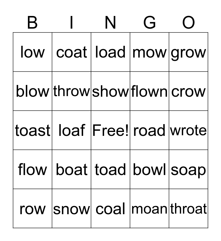 This bingo card has a free space and 24 words: boat, snow, show, row, grow, low, blow, coat, road, toad, flown, toast, bowl, soap, throw, moan, wrote, load, crow, loaf, throat, flow, mow and coal.