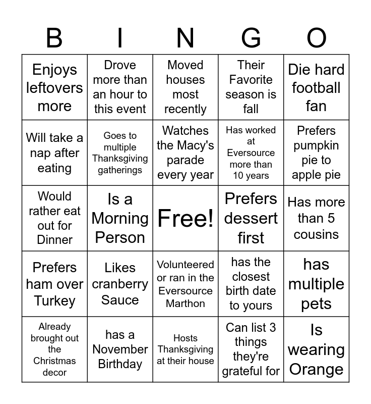 This bingo card has a free space and 24 words: Likes cranberry Sauce, has a November Birthday, Watches the Macy's parade every year, Already brought out the Christmas decor, Die hard football fan, Enjoys leftovers more, Will take a nap after eating, Drove more than an hour to this event, Prefers dessert first, Volunteered or ran in the Eversource Marthon, Has worked at Eversource more than 10 years, Would rather eat out for Dinner, has the closest birth date to yours, has multiple pets, Goes to multiple Thanksgiving gatherings, Can list 3 things they're grateful for, Has more than 5 cousins, Moved houses most recently, Prefers pumpkin pie to apple pie, Is a Morning Person, Is wearing Orange, Prefers ham over Turkey, Their Favorite season is fall and Hosts Thanksgiving at their house.