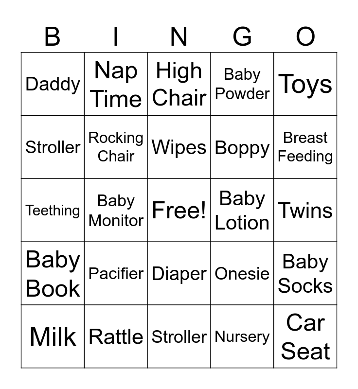 This bingo card has a free space and 44 words: Bottle, Car Seat, Ultrasound, Milk, Play Pen, Nursery, High Chair, Cradle, Toys, Rattle, Baby Powder, Baby Lotion, Diaper, Pacifier, Booties, Stroller, Bibs, Teething, Formula, Breast Feeding, Nap Time, Blanket, Mommy, Daddy, Labor, Twins, Due Date, Baby Bouncer, Onesie, Baby Book, Burp Cloth, Baby Socks, Hooded Towel, Swaddle, Baby Monitor, Bassinet, Bottle Warmer, Diaper Cream, Wipes, Stroller, Boppy, Baby Swing, Rocking Chair and Diaper Bag.