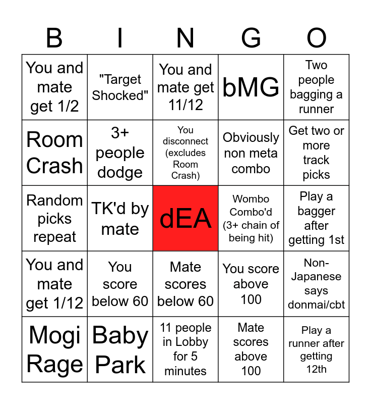 This bingo card has a free space and 24 words: You score below 60, Baby Park, You disconnect (excludes Room Crash), Mogi Rage, Two people bagging a runner, You and mate get 1/2, Room Crash, "Target Shocked", Wombo Combo'd (3+ chain of being hit), Mate scores below 60, Obviously non meta combo, Random picks repeat, You score above 100, Non-Japanese says donmai/cbt, 3+ people dodge, Mate scores above 100, Play a bagger after getting 1st, You and mate get 11/12, Get two or more track picks, TK'd by mate, Play a runner after getting 12th, You and mate get 1/12, bMG and 11 people in Lobby for 5 minutes.