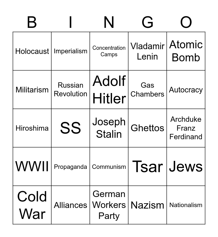 This bingo card has a free space and 24 words: Propaganda, Alliances, Adolf Hitler, Cold War, Atomic Bomb, Holocaust, Militarism, Imperialism, Ghettos, Communism, Gas Chambers, Hiroshima, Tsar, Jews, Russian Revolution, Nazism, Archduke Franz Ferdinand, Concentration Camps, Autocracy, SS, Nationalism, WWII, Vladamir Lenin and German Workers Party.