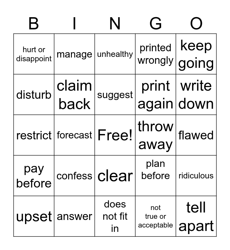 This bingo card has a free space and 24 words: confess, answer, suggest, upset, keep going, hurt or disappoint, disturb, manage, throw away, clear, print again, restrict, plan before, ridiculous, claim back, not true or acceptable, flawed, unhealthy, write down, forecast, tell apart, pay before, printed wrongly and does not fit in.