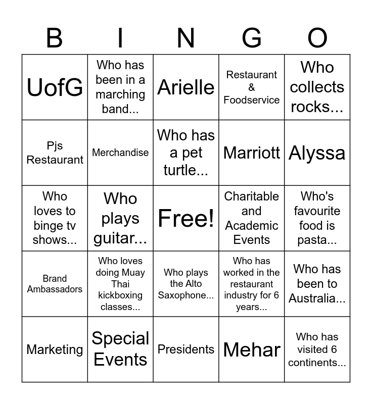 This bingo card has a free space and 42 words: Who has worked in Whistler..., Who has a pet turtle..., Who loves to ski..., Who loves doing Muay Thai kickboxing classes..., Mehar, Who has been to Australia..., Who has visited 6 continents..., Who has 2 Tasmanian labradoodle puppies..., Arielle, Who plays the Alto Saxophone..., Who's favourite food is pasta..., Alyssa, Who plays guitar..., Who collects rocks..., Who has been surfing with seals in Alaska..., Who has worked in the restaurant industry for 6 years..., Saige, Who loves to binge tv shows..., Who has never broken a bone..., Who has been in a marching band..., Pjs Restaurant, #EatSleepTravel, Macdonald Stewart Hall, UofG, Think Pink, Palatine Hills Winery Tour, Marriott, Fairmont, Mocktail Mixer, Delta Guelph, Finance, Brand Ambassadors, Merchandise, Presidents, HAC, Marketing, Special Events, Charitable and Academic Events, Corporate Relations, Hotel & Lodging, Restaurant & Foodservice and Tourism.