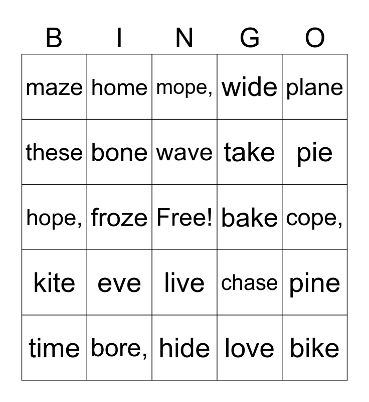 This bingo card has a free space and 49 words: cake, bike, gave, hide, eve, Pete, home, shape, these, lake, bone, wide, pine, chase, white, five, wave, bake, quiet, plane, froze, love, maze, take, gate, pie, time, wipe, live, kite, skate, stove, grace, bone,, bore,, code,, coke,, cone,, cope,, core,, cove,, doze,, hole,, home,, hope,, mope,, nope,, note, and poke,.