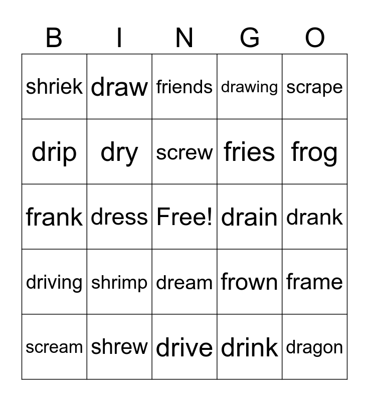 This bingo card has a free space and 24 words: shrimp, shrew, screw, scream, scrape, shriek, drip, draw, drain, dream, fries, frank, frown, frame, dry, drink, drank, friends, frog, dress, dragon, driving, drawing and drive.