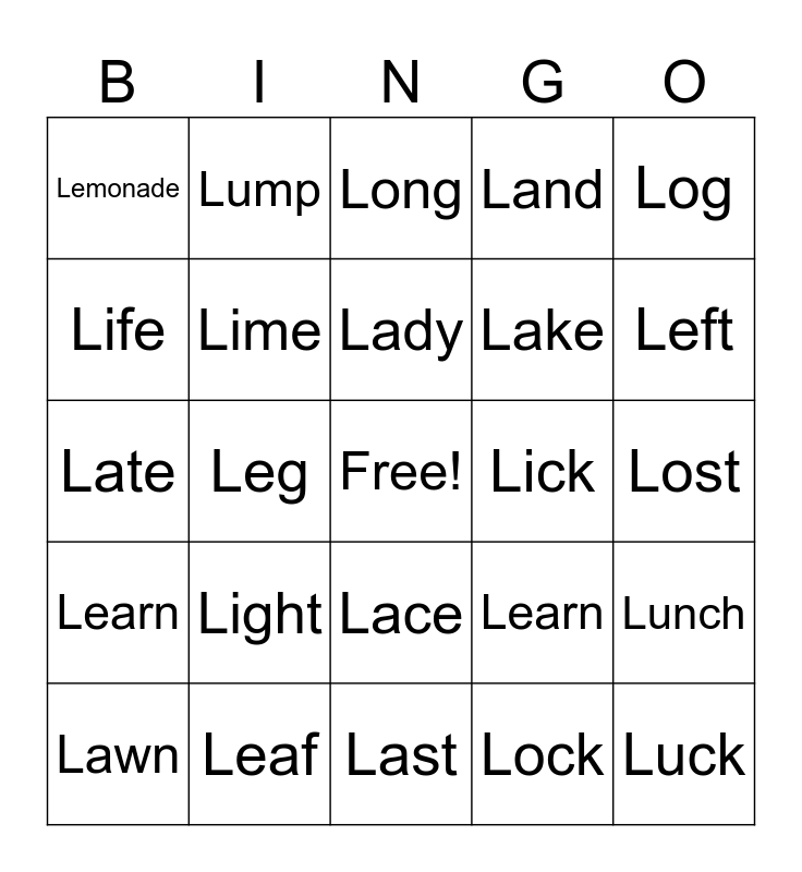 This bingo card has a free space and 24 words: Light, Leaf, Lady, Lawn, Log, Lemonade, Life, Lump, Lick, Lace, Lake, Late, Learn, Lunch, Lime, Lock, Lost, Long, Left, Leg, Luck, Learn, Land and Last.