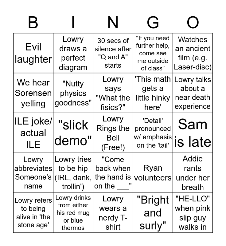 This bingo card has a free space and 24 words: Lowry tries to be hip (IRL, dank, trollin'), Lowry drinks from either his red mug or blue thermos, Lowry says "What the fisics?", Lowry refers to being alive in 'the stone age', Watches an ancient film (e.g. Laser-disc), Evil laughter, We hear Sorensen yelling, Lowry draws a perfect diagram, 'Detail' pronounced w/ emphasis on the 'tail', "Come back when the hand is on the ___", 'This math gets a little hinky here', ILE joke/ actual ILE, Ryan volunteers, Addie rants under her breath, "Nutty physics goodness", "Bright and surly", Sam is late, 30 secs of silence after "Q and A" starts, Lowry talks about a near death experience, "slick demo", "HE-LLO" when pink slip guy walks in, Lowry abbreviates Someone's name, "If you need further help, come see me outside of class" and Lowry wears a nerdy T-shirt.
