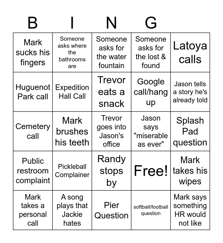 This bingo card has 25 words: Pickleball Complainer, Pier Question, Trevor eats a snack, Mark takes a personal call, Latoya calls, Mark sucks his fingers, Huguenot Park call, Someone asks where the bathrooms are, Jason says "miserable as ever", Randy stops by, Google call/hang up, Cemetery call, Free!, Mark takes his wipes, Expedition Hall Call, Mark says something HR would not like, Splash Pad question, Someone asks for the water fountain, Jason tells a story he's already told, Mark brushes his teeth, Trevor goes into Jason's office, A song plays that Jackie hates, Public restroom complaint, Someone asks for the lost & found and softball/football question.