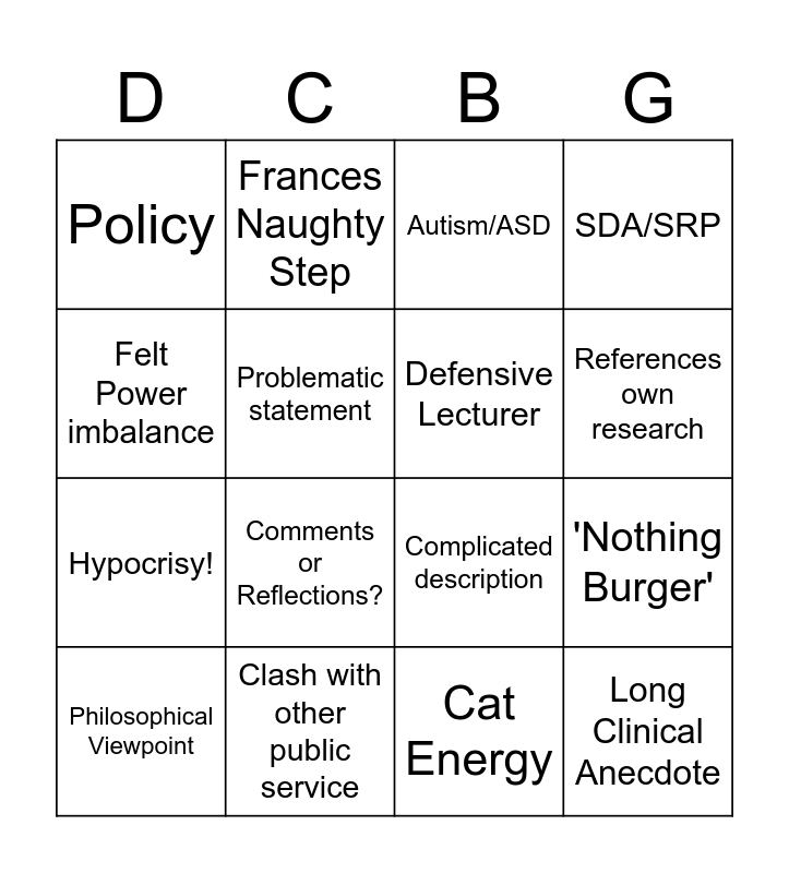 This bingo card has 76 words: Qualitative, Challenging Behaviour, Autism/ASD, Reflect, Context, Reading off slides, Lecturer technical difficulties, >5 second silence, Quantitative, CBT Bashing, Systemic Bashing, Psychodynamic Bashing, References own research, Problematic statement, Named discomfort, 'Nothing Burger', Acronym, Philosophical Viewpoint, Assignment reference, Felt Power imbalance, Placement, Complicated description, Defensive Lecturer, Frances Naughty Step, SDA/SRP, Ethics, Thesis, Schema, Reference to own research, Learning Disability, Break not taken on time, Table/pair activity, Comment on number of attendees at seminar, 'Wondering', Comments or Reflections?, Hypocrisy!, Feedback, Curiosity, Cat Energy, Dog Energy, Handbook, NICE Guidelines, Anxiety, Depression, Evidence Base/Evidence Based, Outcomes, Goals, Policy, MDT meeting, Lecturer Icebreaker, 'Join my service' Pitch, Co-Production, Used Analogy, Risk, Fire Alarm!!!, CYP-IAPT, iTHRIVE, Corporate Speak, Neuro-diveristy, Families, COVID Reference, Lecturer picks out their trainee, Oppositional Question, Danny-ism, NHS Bashing, Forget Feedback Code, Clash with other public service, Sympathy/Nervous laugh, Refusal to believe provable fact, Admin Cameo, COVID Related Adjustment, Long Clinical Anecdote, Process, Experts, Meaning and Language.