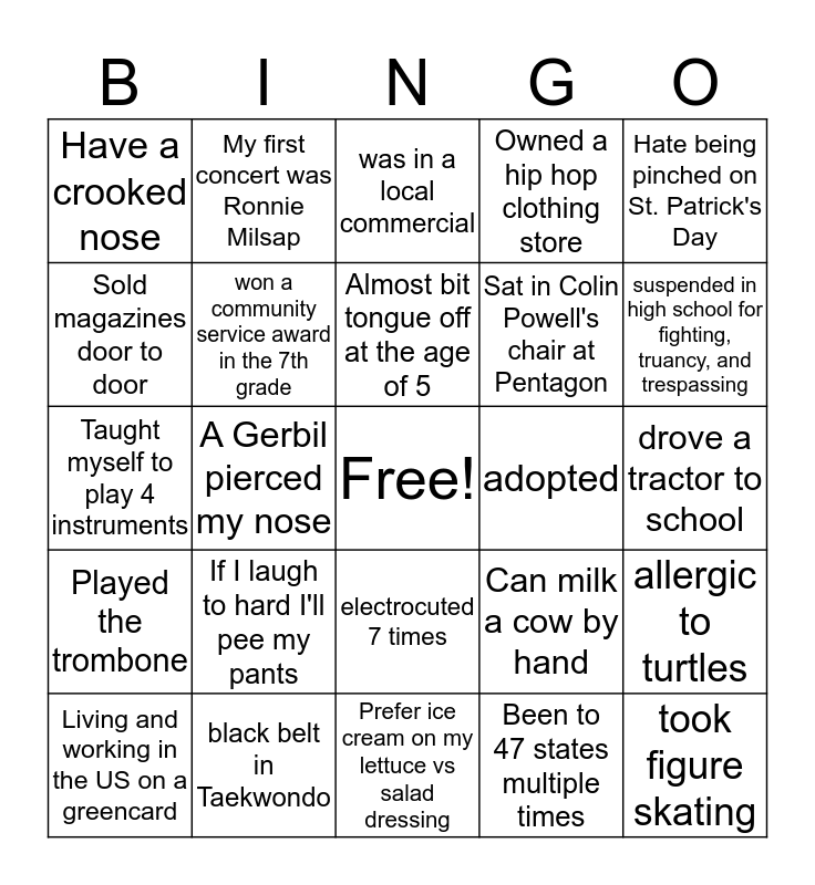This bingo card has a free space and 24 words: If I laugh to hard I'll pee my pants, black belt in Taekwondo, Almost bit tongue off at the age of 5, Living and working in the US on a greencard, Hate being pinched on St. Patrick's Day, Have a crooked nose, Sold magazines door to door, My first concert was Ronnie Milsap, adopted, electrocuted 7 times, Sat in Colin Powell's chair at Pentagon, Taught myself to play 4 instruments, Can milk a cow by hand, allergic to turtles, won a community service award in the 7th grade, Been to 47 states multiple times, drove a tractor to school, was in a local commercial, suspended in high school for fighting, truancy, and trespassing, A Gerbil pierced my nose, took figure skating, Played the trombone, Owned a hip hop clothing store and Prefer ice cream on my lettuce vs salad dressing.