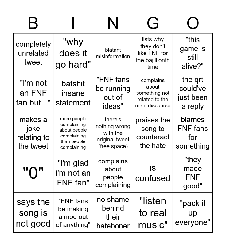 This bingo card has a free space and 24 words: "i'm glad i'm not an FNF fan", "FNF fans be making a mod out of anything", "FNF fans be running out of ideas", says the song is not good, "this game is still alive?", completely unrelated tweet, "i'm not an FNF fan but...", "why does it go hard", praises the song to counteract the hate, complains about people complaining, complains about something not related to the main discourse, makes a joke relating to the tweet, is confused, "they made FNF good", batshit insane statement, "listen to real music", blames FNF fans for something, blatant misinformation, the qrt could've just been a reply, more people complaining about people complaining than people complaining, "pack it up everyone", "0", lists why they don't like FNF for the bajillionth time and no shame behind their hateboner.