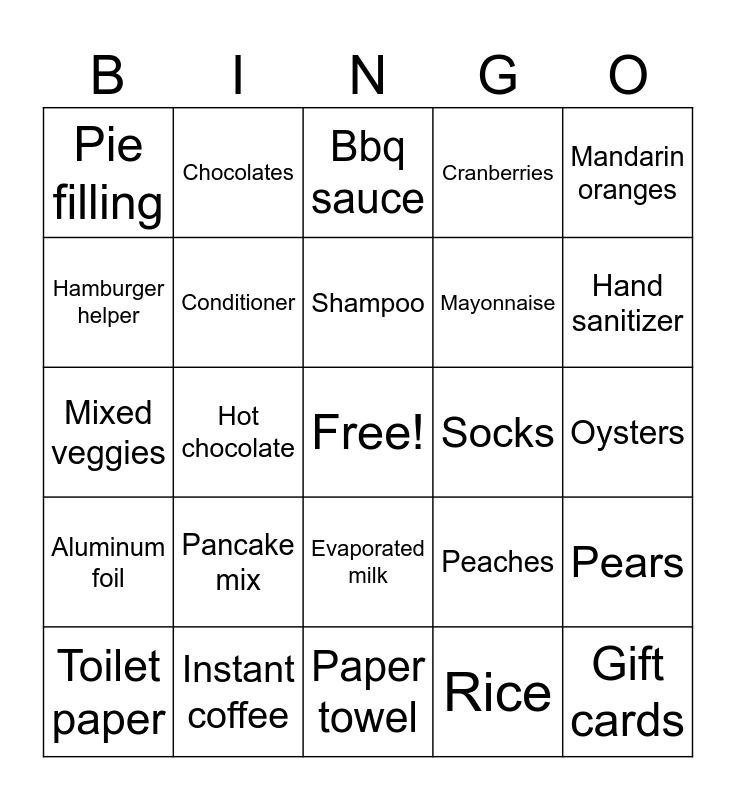 This bingo card has a free space and 81 words: Crackers, Salad dressing, Bbq sauce, Applesauce, Salmon, Coffee, Condiments, Pears, Soda crackers, Cookies, Honey, Cream corn, Cranberries, Pie filling, Kraft dinner, Hamburger helper, Quick oats, Pancake mix, Sardines, Oysters, Instant rice, Mandarin oranges, Mixed veggies, Shampoo, Conditioner, Body wash, Bar soap, Lotion, Shaving cream, Dish soap, Hand sanitizer, Cleaning supplies, Paper towel, Kleenex, Toilet paper, Socks, Hats, Gloves, Scarves, Lip balm, Gift cards, Letters to our Veterans, Tim Hortons gift cards, Postage stamps, Hot chocolate, Hand warmers, Chocolates, Toiletries, Ornaments, Chili, Peaches, Pears, Fruit cocktail, Tuna, Chef Boyardee, Cranberry sauce, Tuna kits, Pudding cups, Granola bars, Juice, Evaporated milk, Crackers, Stove top stuffing mix, Turkeys, Gas cards, Visa cards, Store gift cards, Candy, Razors, Shaving cream, Saran wrap, Aluminum foil, Instant coffee, Dry beans, Cat food, Dog food, Zip lock bags, Rice, Pickles, Mayonnaise and Canned meats.