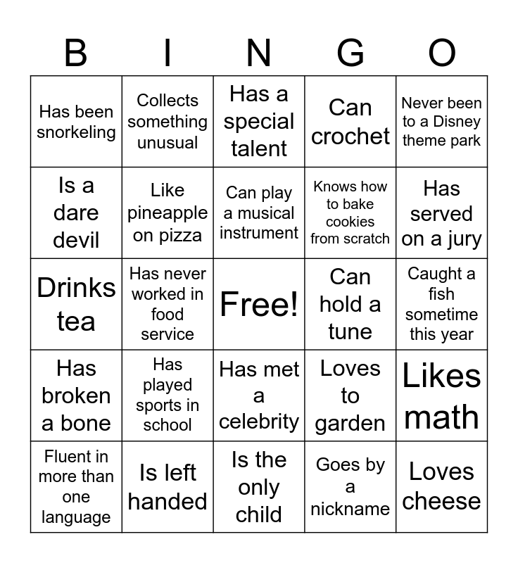 This bingo card has a free space and 24 words: Has played sports in school, Is left handed, Can play a musical instrument, Fluent in more than one language, Never been to a Disney theme park, Has been snorkeling, Is a dare devil, Collects something unusual, Can hold a tune, Has met a celebrity, Knows how to bake cookies from scratch, Drinks tea, Loves to garden, Likes math, Like pineapple on pizza, Goes by a nickname, Caught a fish sometime this year, Has a special talent, Has served on a jury, Has never worked in food service, Loves cheese, Has broken a bone, Can crochet and Is the only child.