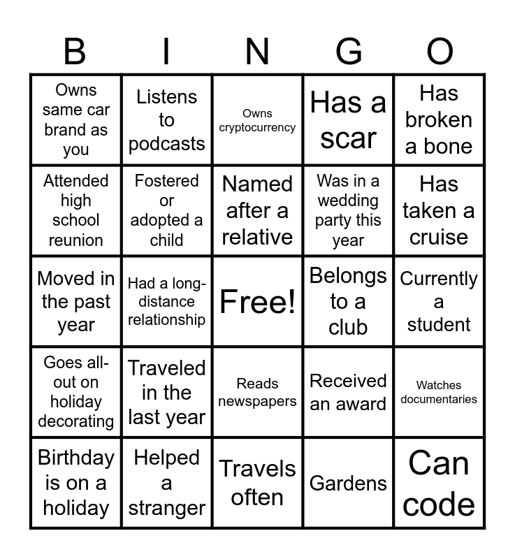 This bingo card has a free space and 73 words: Good human Bingo questions, Same birth month as you, Owns same car brand as you, Never flown on an airplane, Never learned to ride a bike, Collects something, Goes all-out on holiday decorating, Recently handmade a gift, Received an award, Has performed in public, Has a phobia, Has a BFF from high school, Fostered or adopted a child, Currently a student, Took a how-to class recently, Listens to podcasts, Travels often, Attended high school reunion, Has food allergies, Belongs to a club, Named after a relative, Has a scar, Has broken a bone, Has a nickname, Birthday is on a holiday, Has a bucket list, Makes New Year’s resolutions, Good cook, Taught a class, Had a secret admirer, Helped a stranger, Got help from a stranger, Worked at a family business, Visited 4+ continents, Had a long-distance relationship, Took dance lessons, Bingo questions for adults, Speaks 2+ languages, Can code, Won a contest, Gardens, Traveled in the last year, Can bake a cake from scratch, Knows the whole periodic table, Can do basic car repairs, Was in a wedding party this year, Owns cryptocurrency, Invests in the stock market, Climbed a mountain, Moved in the past year, Owns a boat, Has a big backyard, Digital nomad, Notary public, Lives near a coffee shop, Lives in a rural area, Can drive stick, Reads newspapers, Does stand up comedy, Owns a vacation house, Started a business, Firefighter or EMT, Has been in a hot air balloon, Has taken a cruise, Won a race, Ran in a marathon, Has a side hustle, Regularly writes reviews, Watches documentaries, Knows calligraphy, Brews beer, Built an app and Mixologist.