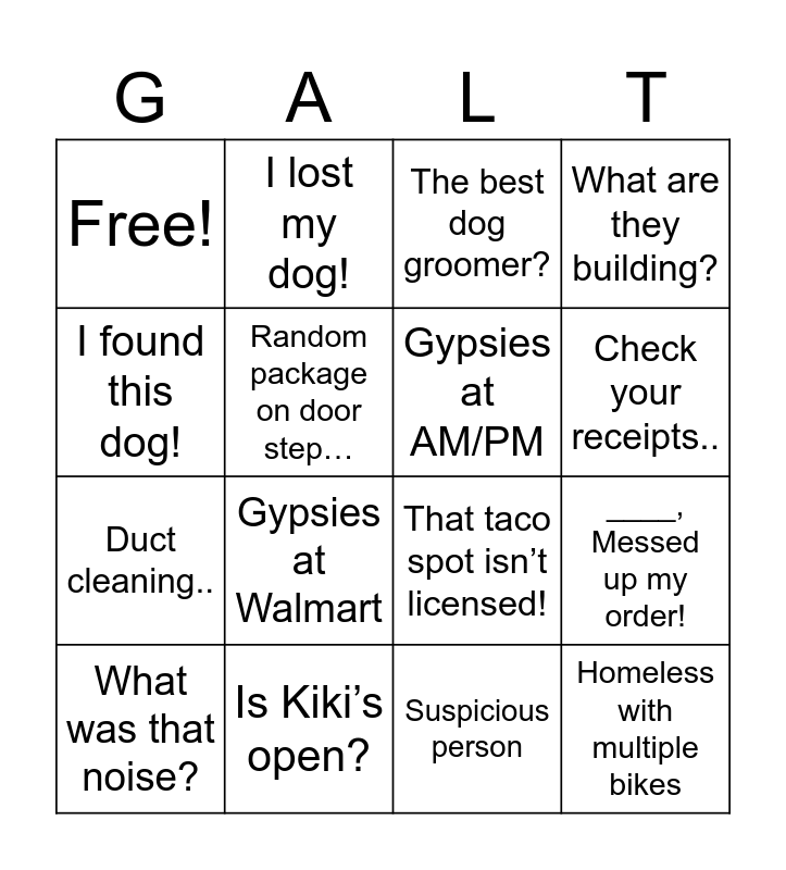 This bingo card has 16 words: What was that noise?, Is Kiki’s open?, The best dog groomer?, What are they building?, I found this dog!, I lost my dog!, That taco spot isn’t licensed!, ____, Messed up my order!, Free!, Random package on door step…, Suspicious person, Check your receipts.., Duct cleaning.., Gypsies at Walmart, Gypsies at AM/PM and Homeless with multiple bikes.