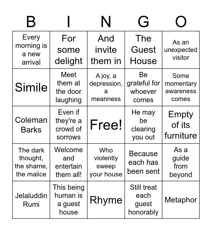 This bingo card has a free space and 24 words: Welcome and entertain them all!, This being human is a guest house, A joy, a depression, a meanness, Jelaluddin Rumi, As an unexpected visitor, Every morning is a new arrival, Simile, For some delight, He may be clearing you out, Who violently sweep your house, Be grateful for whoever comes, Coleman Barks, Because each has been sent, As a guide from beyond, Meet them at the door laughing, Still treat each guest honorably, Empty of its furniture, And invite them in, Some momentary awareness comes, Even if they're a crowd of sorrows, Metaphor, The dark thought, the shame, the malice, The Guest House and Rhyme.