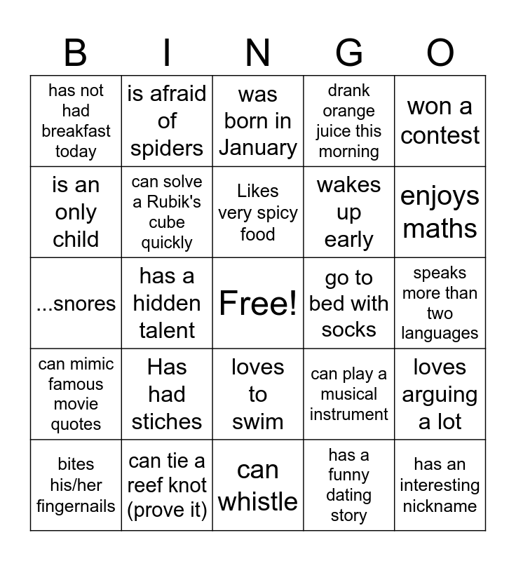 This bingo card has a free space and 24 words: Has had stiches, can tie a reef knot (prove it), Likes very spicy food, bites his/her fingernails, won a contest, has not had breakfast today, is an only child, is afraid of spiders, go to bed with socks, loves to swim, wakes up early, ...snores, can play a musical instrument, loves arguing a lot, can solve a Rubik's cube quickly, has a funny dating story, speaks more than two languages, was born in January, enjoys maths, has a hidden talent, has an interesting nickname, can mimic famous movie quotes, drank orange juice this morning and can whistle.