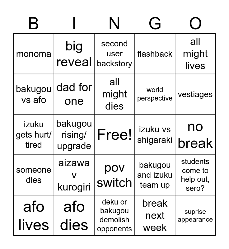 This bingo card has a free space and 24 words: aizawa v kurogiri, afo dies, all might dies, afo lives, all might lives, monoma, bakugou vs afo, big reveal, izuku vs shigaraki, pov switch, world perspective, izuku gets hurt/ tired, bakugou and izuku team up, students come to help out, sero?, dad for one, break next week, no break, second user backstory, vestiages, bakugou rising/ upgrade, suprise appearance, someone dies, flashback and deku or bakugou demolish opponents.