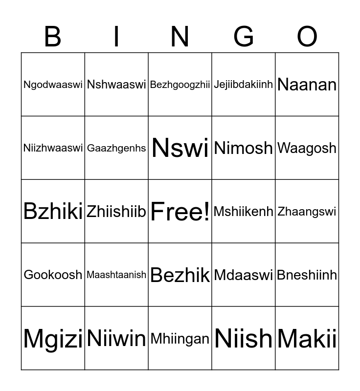 This bingo card has a free space and 26 words: Bezhik, Niish, Nswi, Niiwin, Naanan, Ngodwaaswi, Niizhwaaswi, Nshwaaswi, Zhaangswi, Mdaaswi, Nimosh, Bzhiki, Bneshiinh, Mgizi, Zhiishiib, Baakaakwenh, Jejiibdakiinh, Gookoosh, Bezhgoogzhii, Makii, Waagosh, Mhiingan, Mshiikenh, Maashtaanish, Gaazhgenhs and Waabganoojiinhs.