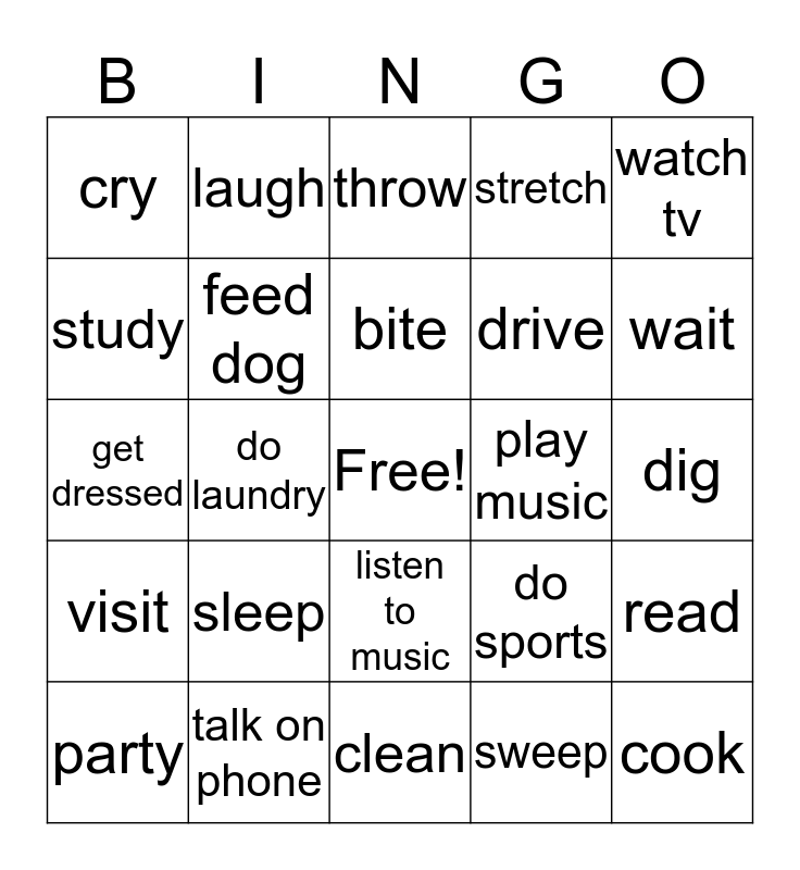 This bingo card has a free space and 24 words: sleep, talk on phone, bite, party, watch tv, cry, study, laugh, play music, listen to music, drive, get dressed, do sports, read, feed dog, sweep, dig, throw, wait, do laundry, cook, visit, stretch and clean.